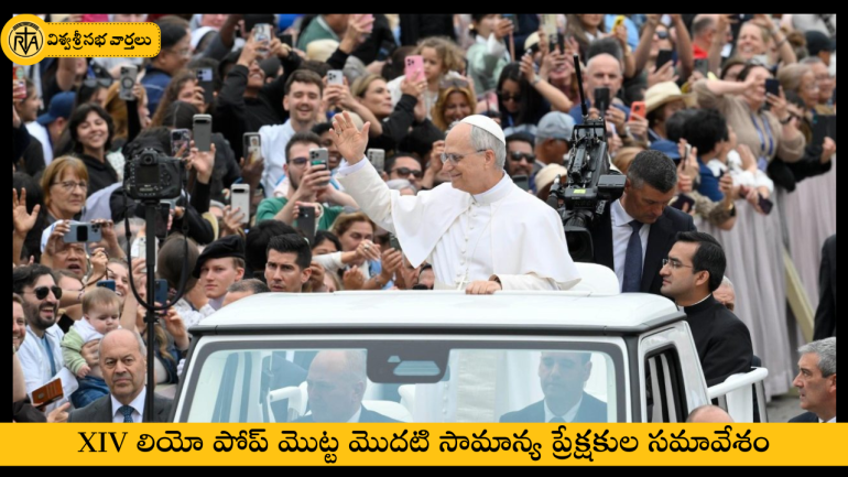 మే 21 ,2025 న సెయింట్ పీటర్స్ స్క్వేర్లో పోప్ లియో XIV తన మొదటి సామాన్య ప్రేక్షకుల సమావేశంలో పాల్గొన్నారు.