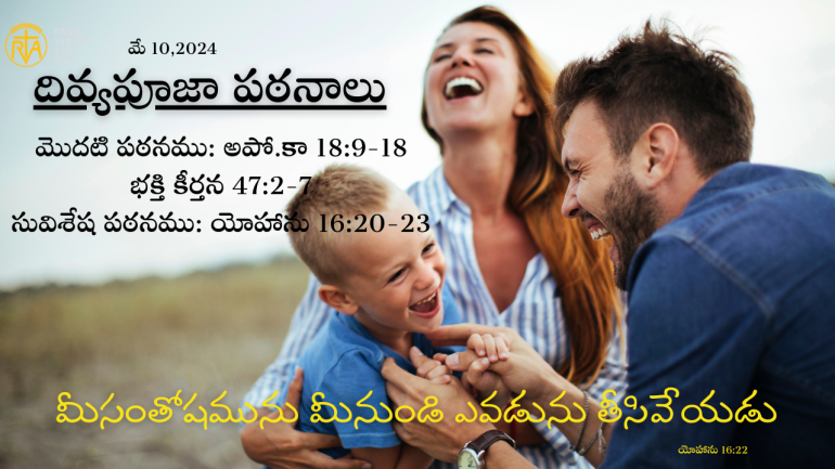 సత్యోపదేశము దివ్యపూజా పఠనాలు మే 10,2024 By Telugu Service, 10 May, 2024 మొదటి పఠనము: అపో.కా 18:9-18 భక్తి కీర్తన 47:2-7 సువిశేష పఠనము: యోహాను 16:20-23 Tags #catholic #radioveritasasia #rvatelugu #telugucatholic #radioveritasasiatelugu Your name Comment Related పాపు గారి సందేశం అగస్టీనియన్ ఆశ్రమాన్ని సందర్శించిన పోప్ లియో పాపు గారి సందేశం ప్రపంచ చలనచిత్ర సభ్యులతో సమావేశమైన పోప్ లియో సత్యోపదేశము దివ్యపూజా పఠనాలు | Daily Mass Reading| November 4, 2025 More సత్యోపదేశము సత్యోపదేశము దివ్యపూజా పఠనాలు | Daily Mass Reading | 11 December 2025 సత్యోపదేశము దివ్యపూజా పఠనాలు | Daily Mass Reading | 10 December 2025 సత్యోపదేశము దివ్యపూజా పఠనాలు | Daily Mass Reading | 9 December 2025